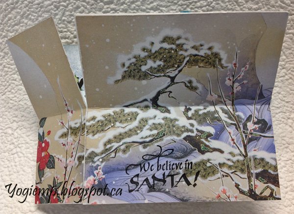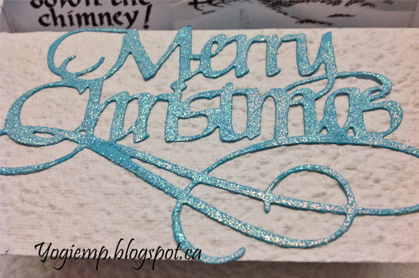 Die cut the Merry Christmas from a light blue cardstock, then inked it with Versamark and embossed with Emerald Creek "Turquoise Shimmer" embossing powder. Adhered to flap. |