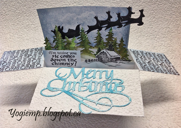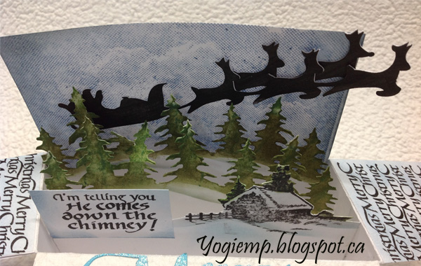 Before the box was glued together to make the box card, I decorated the inside by stamping the cloud background (Impression Obsession Cover A Card "Clouds") inking with various Distress blues. Electronically cut the Santa sleigh & reindeers from white cardstock and colored while still on my mat using Distress dabbers "Black Soot". I cut off the first 2 reindeer and adhered them to the back of the main reindeer. That way I was able to cut my image larger than would fit on my card... Adhered to clouds. Die cut the evergreen trees a couple times (Tim's On The Edge "Tree Line") then colored with various Distress green's. Used the edge of a piece of cardstock to create shadow on the hill, sponging with "Stormy Sky". Stamped the house (AlteNew "Winter Cottage") using Versafne Blac Onyx and clear embossed. Fussy cut around the top edge. Trimmed down the 3 layers as suggested below adding the 1/4" tabs to adhere to the box sides. Stamped the quote onto a piece of white cardstock using the black, clear embossed and trimmed close to stamping. Sponged some blue around the edges and adhered to the house line. |
