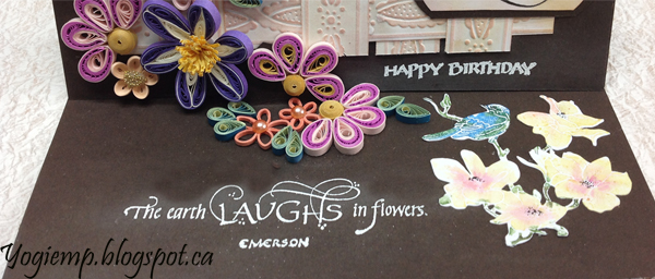 On the floor: Cut a small piece of the brown cardstock to act as my stopper, folding it in half and adhering more quilled flower, then adhering to the floor. Stamped the quote using the white and embossing with the white. (looks like there is a bit of residue from my static powder...) Adhered the bird on flowers piece raided from my electronically cut stamping stash... (Local King Rubber "Asian Essence") |
