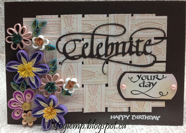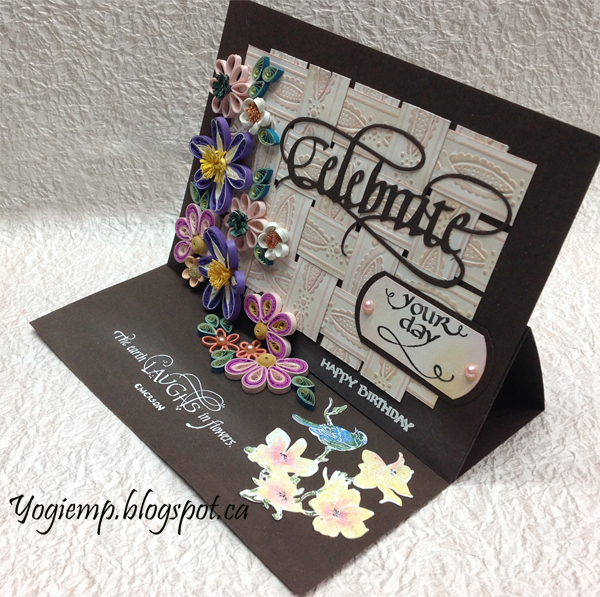 Scored and folded my dark brown cardstock (Paper-Garden.ca "Flavours Gourmet Cardstock - Moroccan Cocoa") to create the easel, then cut another piece the same size as front and adhered. adhered all my quilled elements (leftovers from various 2016 quilling sessions...) Die cut the "Celebrate" from the brown scraps and adhered to front. Masked and stamped the "your day" on white cardstock using Versafine Black Onyx and clear embossed. Trimmed close to stamping and used a circle punch to round the ends. Sponged around with the sugar and linen. Cut the brown under layer and adhered both together then onto the card. |