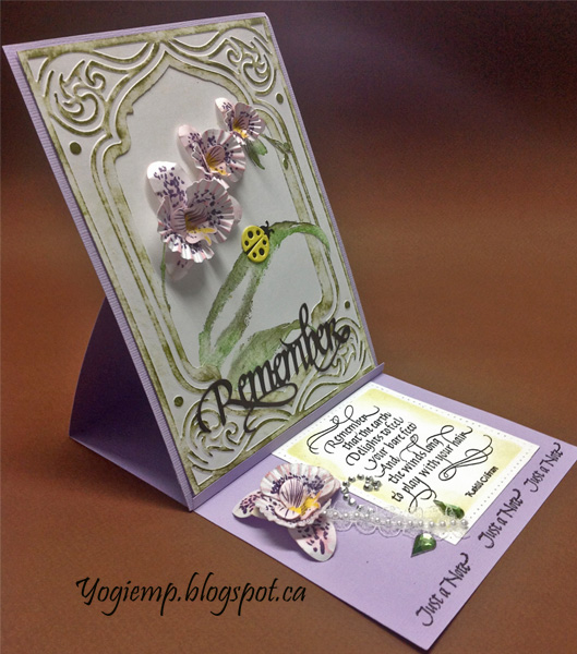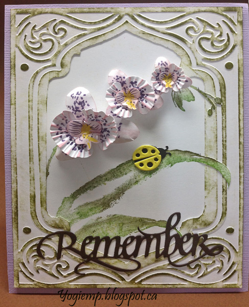 Created and electronically cut my frame (Cuttlebug "Winter Frolic" set), then ran it through my embossing machine (see pics and directions below). Direct to paper with large Distress pads "Crushed Olive" all over, then with "Forest Moss" here and there. Stamped the Penny Black "Gentle Whisper" onto white cardstock using Distress pads in various green's, omitting inking the flower section, misted with water and stamped. Cut the ends of the leaves so they would fall outside the frame. Adhered to frame then adhered to front. Cut the petals of the orchid in 3 sizes and instead of stamping the pattern I used markers and stamp pads to color. Misted the back of the cardstock of the flowers top layer and crimped the edge, then direct to paper with the pad on the high points. Tooled the other elements. Assembled and adhered to front. Die cut the ladybug (Elizabeth Craft Designs) colored and adhered to front. Die cut the word "Remember" from a chocolate brown cardstock and adhered to front. |
