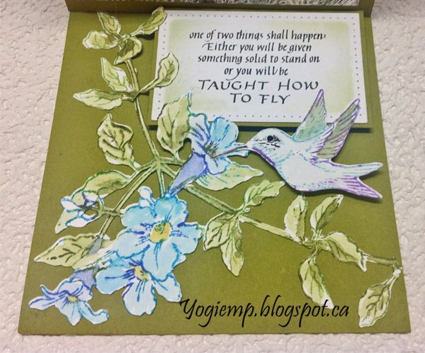 Created and electronically cut file of my stamped images and cut from white cardstock. Inked the stamps with Distress pads, misted with water and stamped on the cut pieces. Used a water brush the add and move color. Allowed to dry. Adhered the large hummingbird to the front using 3D foam tape. |