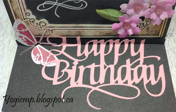 On the floor: Stamped and fussy cut the butterfly (Penny Black "Three Butterflies") using the Picket Fence and white embossing powder on a pink Color Burst decorated cardstock. Cut a 1/2" strip of the brown cardstock the length of the card, scored and folded it in half and adhered to the floor to act as my stopper. Adhered half the butterfly to the floor and partially to the strip. Die cut the "Happy Birthday from a pink toned cardstock and adhered to floor, also adhering partially to the strip. |