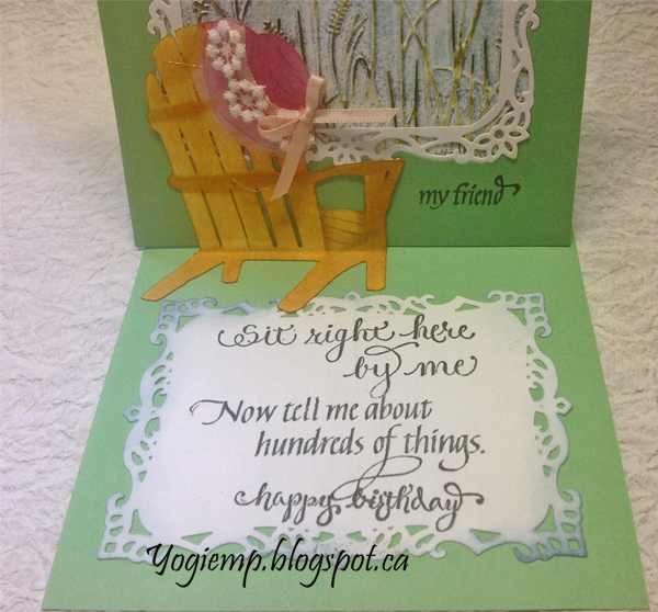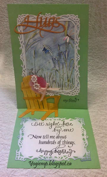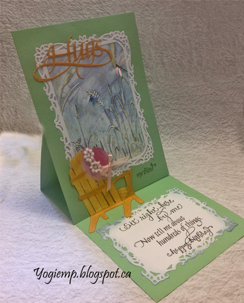 Created: July 2, 2017 Just got a "new" embossing folder (Darice "Grasses") and after making my samples to put into my database book, I realized I already had it...sheesh. So I'm using one of the samples I made for this card... I'm using an A Way With Words die "Hugs" from Elizabeth Craft Designs, also available on Quietfire Design HERE And I'm using parts of quotes and a sentiment from Quietfire Design ("Happy Birthday Plain and Simple" 7pce set); ("Garden Bench Collection" 4 pce set); ("Find Yourself a Cup..."); ("We Cannot Tell the Precise Moment... " 2 pce companion set)