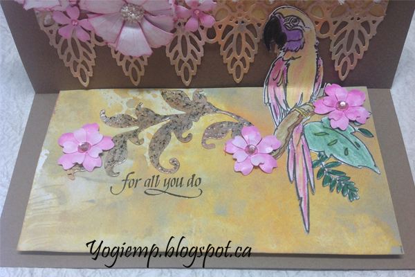 On the floor: used another section of the Oxide background paper for the floor. Adhered to floor with 3D foam tape. Added one of Tim's flourishes and a couple of the pink flowers Electronically cut the macaw shape, then stamped using Versafine Black Onyx. Colored with Prisma colored pencils. adhered the bottom section of the bird to the floor to act as my stopper. Stamped the sentiment with the black and clear embossed. |