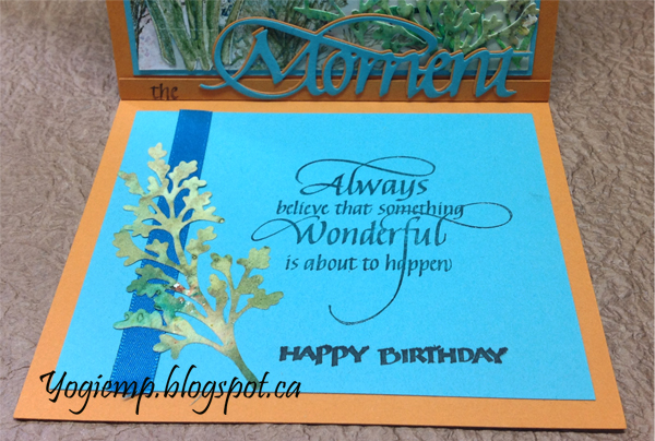 On the floor: Die cut the "Moments" from the aqua and pumpkin cardstocks. Surgically removed the "s" then adhered them together, slightly off set, then onto a pumpkin bar to act as my stopper. Stamped the word "the", masking it from the rest of the quote using Versafine Black Onyx. Stamped the quote and Happy Birthday on a piece of the aqua cardstock using Versafine "Majestic Blue" and clear embossing. Adhered to floor. Adhered a piece of blue narrow satin ribbon on the left side, then a die cut maidenhead fern. |