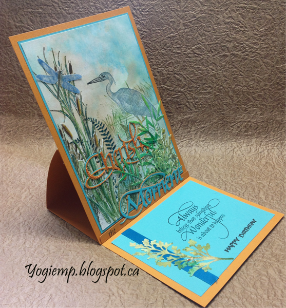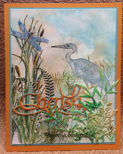 I used a heck of a lot of stamps, both stamped on the card and or fussy cut (electronic cutter) around the images. Heron large (Old Island); Bulrushes and Bulrushes edger (Paper Parachute); Floral - fern (Rubbernecker); Hill Fern (Beeswax); Cattails (Posh); Swan Lake (Flourishes) all stamped and enhanced with colored pencils. The dragonfly was first stamped, but I found it not emphasized enough, so stamped and clear embossed it on a piece of vellum and cut around it. Die cut the bamboo shoots (Memory Box) and the Maidenhead Fern (Sue Wilson Creative Expressions) from Color Burst/Brushos decorated papers. Die cut the Cherish from the aqua and pumpkin cardstocks. Adhered both together slightly off set. After adhering, found it wasn't pronounced enough, so put a line detail of Stickles glitter through each letter. Adhered the stamped front to a piece of aqua cardstock trimmed down to 1/16" around, then onto the front of the card. |