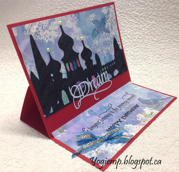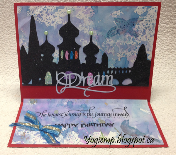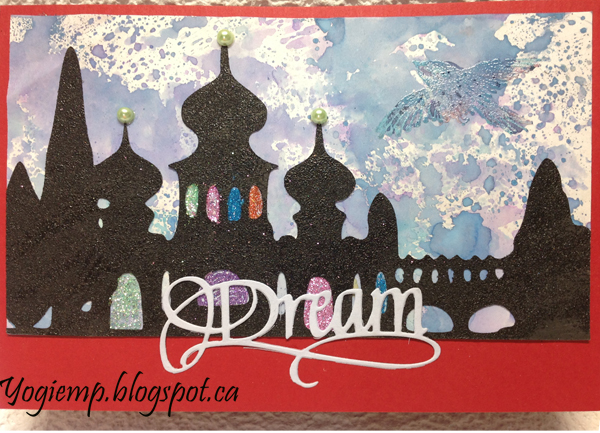 Trimmed down the Oxide background and adhered to front. I electronically cut the Russian Minaret image from white cardstock, painted with Distress Dabber "Black Soot", dried then inked with a black pad and embossed with Distress "Black Soot" embossing powder. Adhered to card front, then filled in the building openings with some glue and sprinkled with various colors of glitter. Die cut the "Dream" from a whitish/blue cardstock. |