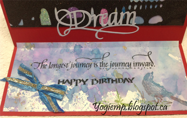 On the floor: Adhered another piece of the Oxide background onto a piece of white cardstock, trimmed down adhering most of it to the floor, but scored a 1/8" ledge to act as my stopper. Stamped the quote and sentiment using Versafine Black Onyx and clear embossed. Stamped the bird (Penny Black "Winged Beauty" set) with Oxide inks and clear embossed. Final touch added a blue/god Sari ribbon bow. |