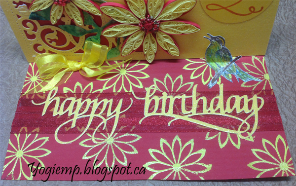 On the floor: Stamped the daisy like flower (My Stamp Box "Abundant Blooms") using Versafine Toffee and embossing with yellow embossing powder. Adhered two pieces of red gauze ribbon. Die cut the "Happy Birthday" from the yellow glitter cardstock and adhered to ribbon. Stamped the bird (Old Island) and colored with Prisma colored pencils. adhered the lower portion of the bird tot he floor having the upper portion of the bird ct as my stopper. Tied a yellow satin/gauze bow and adhered to floor also acting as my stopper. |