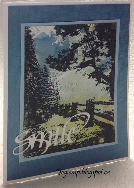 Used my Misti to stamp the "Hidden Lane" using Versafine Black Onyx onto the Oxide background paper, making sure the black was nice and black all over.... Adhered to front of card. Die cut the "Smile" from a white cardstock. |