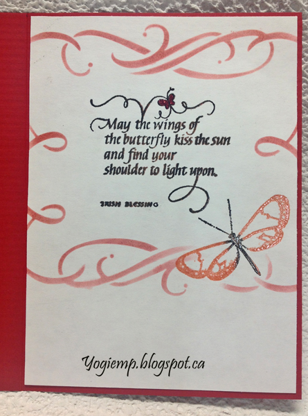 Inside: Stamped the quote with the black and clear embossed. Applied some glue to the mini butterfly and sprinkled with red glitter. Stamped the smallest of the Penny Black butterflies using Versafine Habanera and clear embossed. Sponged Distress "Fired Brick" through the stencil, moving the stencil as needed.