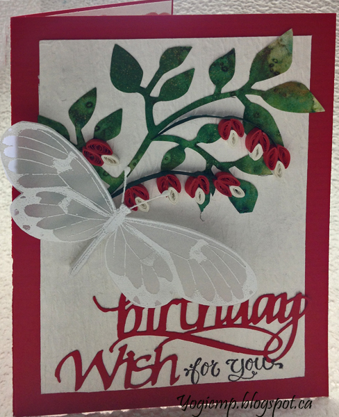 Die cut the leaf sprig (Sizzix Bigz Tim die ""Garden Greens") from a watercolor/gold fleck decorated paper from my stash. Adhered to front, then adhered my quilled elements. Stamped the largest butterfly (Penny Black "Butterfly Trio") from clear vellum using Distress Picket Fence stamp pad and embossing with white embossing powder. Fussy cut around the butterfly, added some flower stamen antennae, then adhering to card front with 3D foam tape along the body only. Die cut the "Birthday Wish" from the red cardstock, surgically removing the "es" from Wishes... Stamped the "For You" using Versafine Black Onyx, masking the rest of the sentiment. |