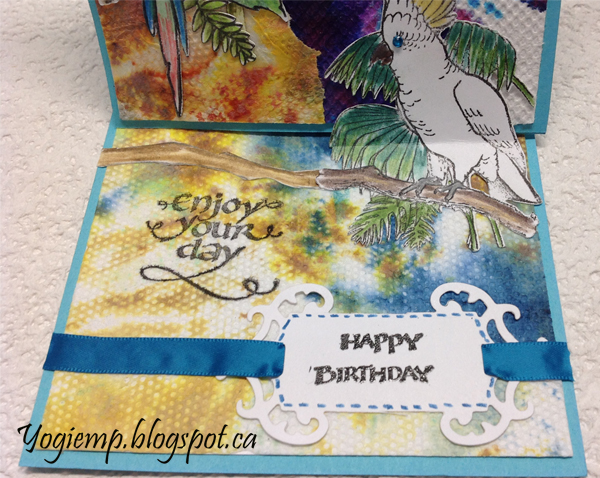 On the floor: Adhered another piece of the paper towel background. Electronically cut a silhouette image of the Cockatoo from white cardstock, inked my stamp (Flonz Craft "Cockatoo") with Versafine Black Onyx and stamped the silhouette. Colored with Prisma colored pencils. Adhered to card front adding an blue mini rhinestone for the eye. Stamped the sentiment using the black. Stamped the "Happy Birthday" onto white cardstock using the black and clear embossed. Die cut using Spellbinders "Fancy Tags 2" set, moving the die over a bit to get a smaller die cut. Added a blue colored pencil stitching detail. adhered to floor, and adhering the blue ribbon through the holes. |
