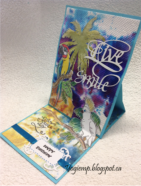 Adhered my paper towel to a thin cardstock using PVA glue, trimmed down and adhered to card front. Electronically cut the palm tree and adhered to front. Electronically cut a silhouette image of the Macaw from white cardstock, inked my stamp (Starving Artistamp "Macaw 2") with Versafine Black Onyx and stamped the silhouette. Colored with Prisma colored pencils. Adhered to card front adding an aqua mini rhinestone for the eye. Die cut the "Live" and "Smiles" from white cardstock, surgically removing the "s" from Smiles. Adhered both words to card front. |