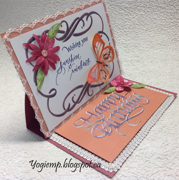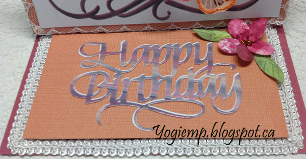 On the floor: die cut the "Happy Birthday" from an alcohol decorated glossy paper and from a white cardstock, adhering both together slightly off set, then onto the orange cardstock. Adhered to floor with 3D foam tape. Adhered the trim around the edges. This flower was created with punched out circles, tooled, pinched, assembled and Nuvo Crystal Drops "Golden Sunset" dropped in the center. |