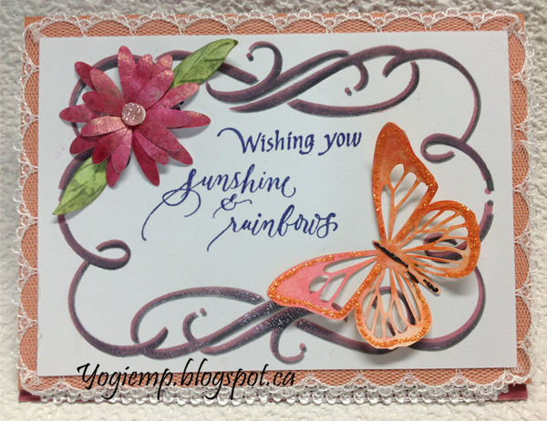 On a piece of white cardstock, stenciled the frame using Distress "Victorian Violet" then shifting the stencil slightly and sponging with "Black Soot", then clear embossing. Created the flower from a Color Burst decorated background paper, then punched a ton of petals out with a mini oval shaped punch. Adhered them on a small punched out circle, tooling the petals for more depth. Added a pink rhinestone center. The die cut butterfly is from my stash and I added some orange glitter Stickles. |