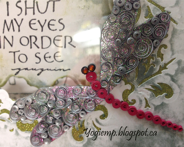 Scored, folded my white cardstock and then die cut the opening in the front of the card using Spellbinder's "Delightful Foliage". Hit the front direct to paper with Distress "Iced Spruce". Cut another piece using the outer border from the set for the inside. Cut a piece of clear Graffix plastic. Applied double sided tape to the inside open leafy section and sprinkled the front with "Chartreuse" glitter, burnishing well. Removed the release papers and adhered the plastic, then adhered the 2nd die cut piece. Adhered my flower quilled elements adding some white leafy ribbon which I strategically cut apart. The dragonfly wings were created from the plastic with double sided tape and glitter applied, then the quilled flourishes adhered. |