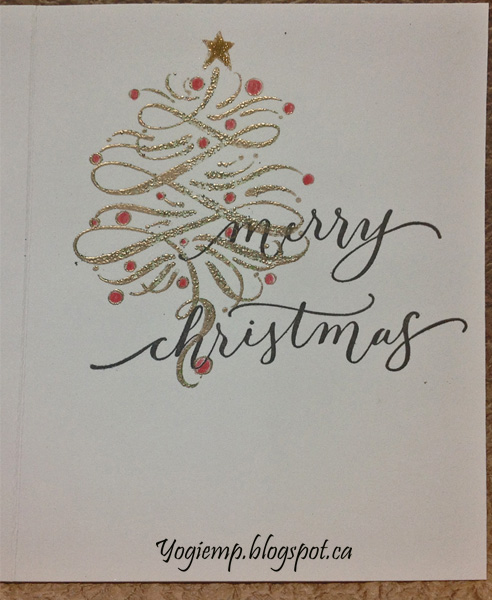 On the inside: Stamped the Flourished tree Distress "Mowed Lawn" and embossed with Queen's Gold embossing powder. Stamped the quote using the black and clear embossed. Colored the ball with a red Prisma colored pencil. Applied Quickie Glue pen to the star and gold glitter. |