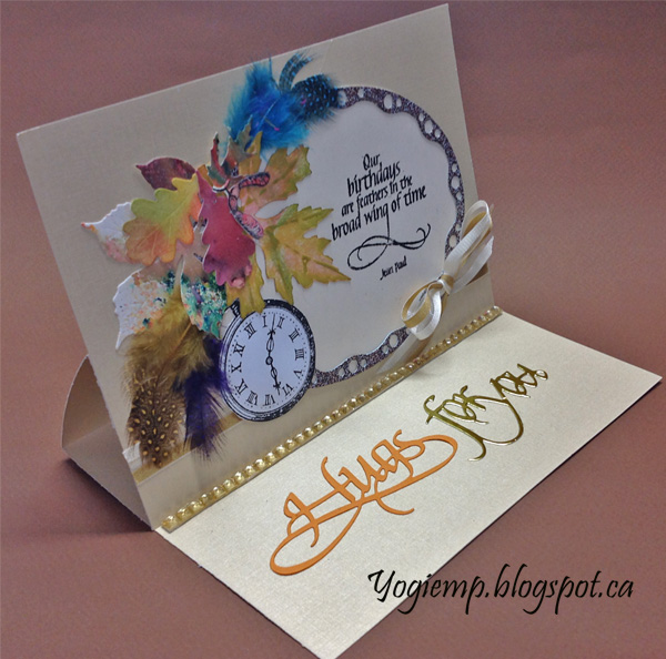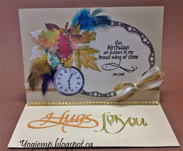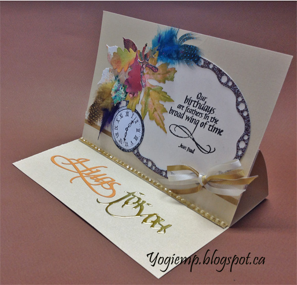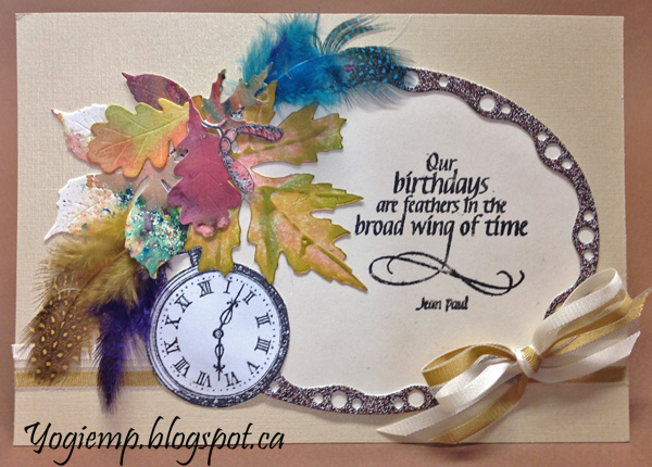 Adhered a 2 toned gold gauze ribbon. The dotted oval is an Elizabeth Craft Designs die set. I cut an under layer from a cream toned cardstock and stamped the quote using Versafine Black Onyx, clear embossed and adhered to front offset. Tied a bow with the gold gauze ribbon and adhered to oval. Assembled and adhered all the bits and pieces. The small leaves are mostly Impression Obsession and the large leaf is Tim's "Layered Leaf". The watch is a stamp and fussy cut (Deep Red "Pocket Watch") Adhered some real feathers. |