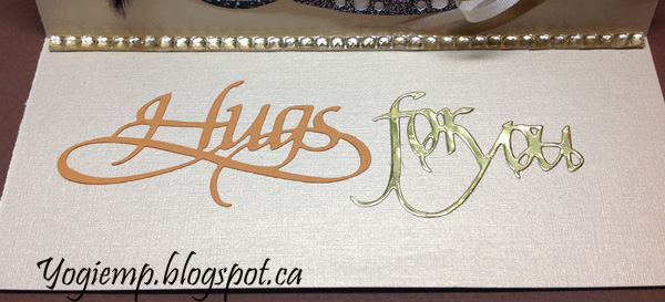 On the floor: adhered a row of gold mosaic rhinestones to act as my stopper. Adhered the words "Hugs" orangey cardstock and "For You" from a gold mirror cardstock from DoCrafts. |