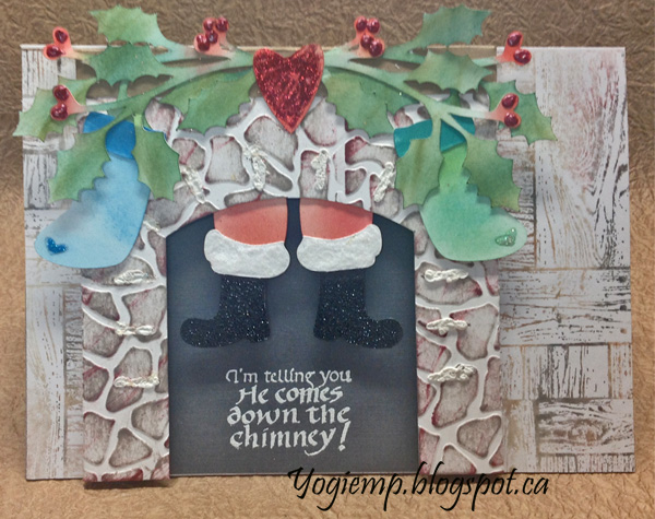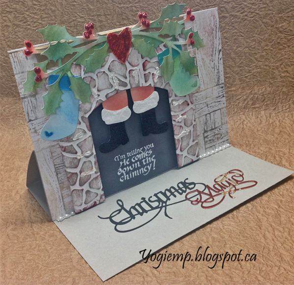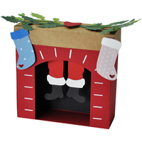 Used the Elizabeth Craft Designs embossing folder "Sea Glass" on the front fireplace piece and hit the high points direct to paper lightly with Distress mini pad "Frayed Burlap" and then very lightly with "Aged Mahogany". Adhered the under fireplace piece so the white shows through the slit holes. Adhered the Santa Boots to the inside of the fireplace. (See below at next cut file pic.) Cut a piece of deep grey cardstock for the back of the fireplace. Folded along the score lines, applied 3D foam tape to the back of the fireplace. Mine is a little over 3mm thick - so scored a 2nd line at that thickness and then adhered the back of the fireplace. Wrapped and adhered the side flaps. Cut and adhered a piece of Kraft cardstock for my mantle and adhered to fireplace. Stamped the quote using Distress Picket Fence and white embossing powder. |