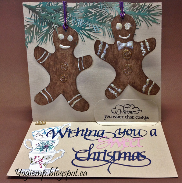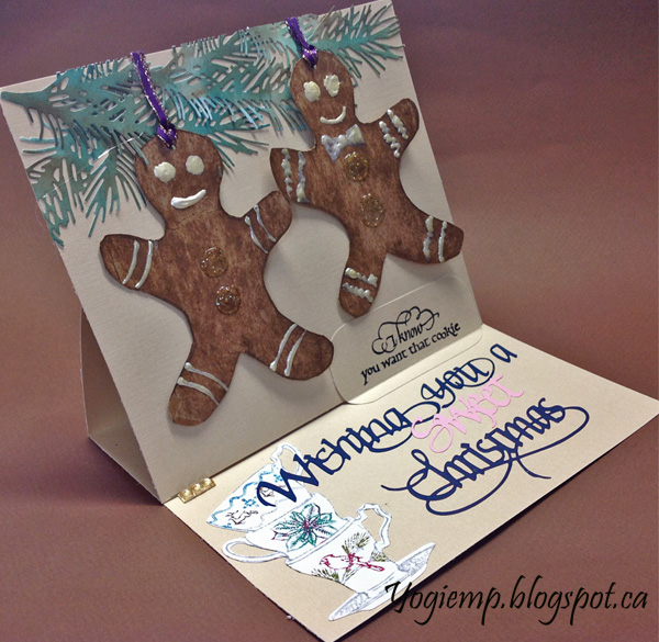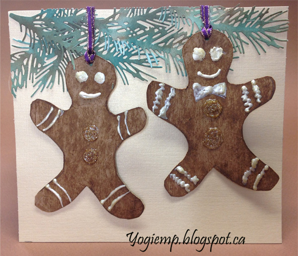 Adhered a bunch of pin boughs (Impression Obsession "Fall Branch") across the top Drew a Gingerbread person a scrap piece of cardstock from the back of a pad and fussy cut. Traced it again to cut a 2nd person. Applied Viva Pearl Pen ""Opal" for the eyes and mouth; "Silver Glitter Liner" for the buttons and "Ice White" for the cuff decoration. When dry, punched a hole at the top and tied a purple/gold narrow ribbon and adhered only the ribbon to card. My cookies hang free... |