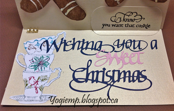 On the floor: I had this stamped and cut teacup image (Flourishes "Christmas Tea") in the stash and adhered to floor. Stamped the sentiment onto a scrap of the gold cardstock scored and adhered to floor to act as my stopper. Cut and adhered 3 gold mosaic rhinestones to help act as my stopper. Adhered all the words. |
