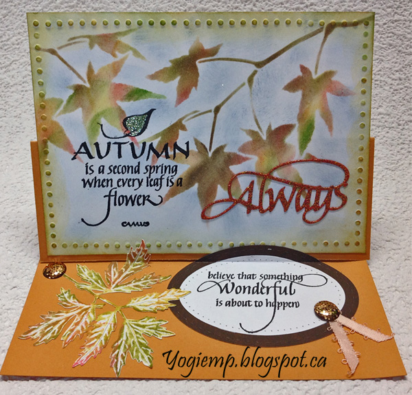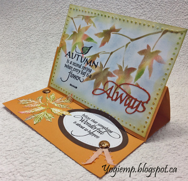 Created the background on white cardstock using Dreamweaver brass stencil "Maple Branch LJ906" and Distress pads in various autumn colors. Trimmed down and embossed around the edges using a Cuttlebug Border embossing folder. Sponged some Distress around the edges to accentuate the dots. Adhered to front. Stamped the quote using Versafine Black Onyx and clear embossed. Used a Quickie glue pen and some green glitter in the leaf shape. Die cut the "Always" from an orange cardstock, inked with Versamark and embossed with Emerald Creek "Thanksgiving" embossing powder. Adhered to front |