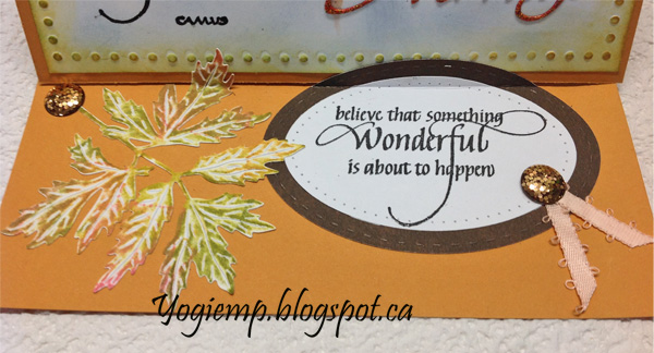 On the floor: Stamped the quote using the black and clear embossed on white cardstock. Die cut using Elizabeth Craft Designs "Stitched Ovals", then cut a larger oval from the dark brown cardstock. Scored a small lip in the oval and adhered to floor to act as my stopper. Adhered a piece of salmon toned ribbon and a gold Shimmer Dome Sticker. Die cut the leaf (Ramsey "Maple Leaf") from white cardstock, sponged with various Distress pads. Adhered to floor. Adhered another gold Shimmer Dome Sticker. |