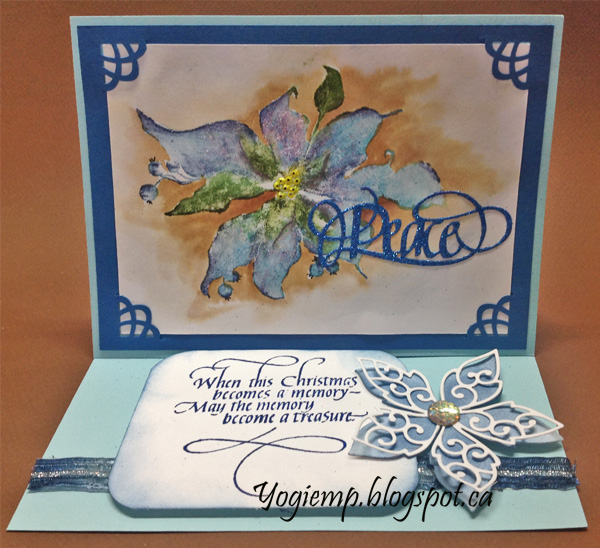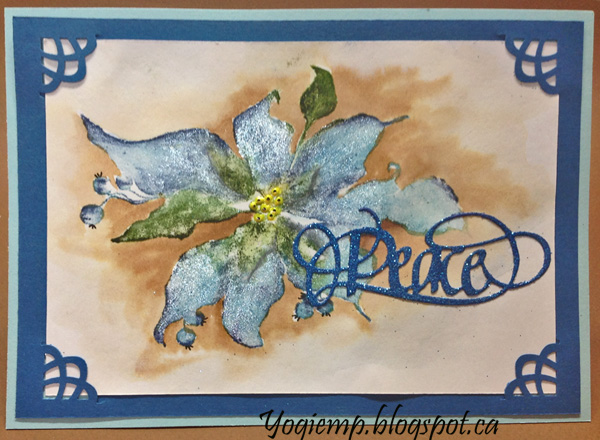 I used Tim's Stamping Platform, Arches HP 110# watercolor paper and a Penny Black stamp ("Scarlet Majesty"), Distress mini pads, a mini mister and a paintbrush. Inking and re-inking the stamp to get the saturation I wanted. Dried the flower thoroughly, then painted the background. Added Liquid Pearls yellow dots in the flower center. When dry, added dots with a sharpie pen. Cut a piece of deep blue cardstock and punched the corners using an EK Success decorative corner punch. Trimmed the poinsettia piece down and adhered under corners, then adhered that to front of card. Die cut the "Peace" from white cardstock, inked with Versafine "Majestic Blue" and embossed with Emerald Creek "Blue Sparkle" embossing powder. |
