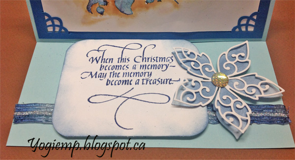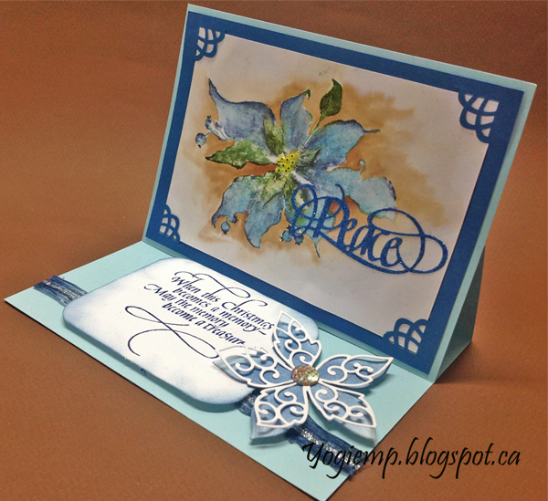 On the floor: Stamped the quote onto white cardstock using the blue and clear embossed. Trimmed down and used a corner rounder on the corners. Sponged with a bit of Distress "Faded Jeans". Adhered to floor with 3D foam tape to act as my stopper. Adhered a piece of blue variegated Sari ribbon to the floor. Die cut the poinsettia (Elizabeth Craft Designs) from white cardstock, sponged the underlayer with the Faded Jeans and adhered the filigree layer at the center only, then onto the floor. Adhered a jewel to the center. |