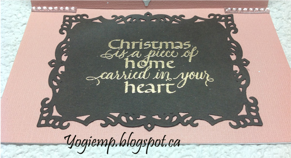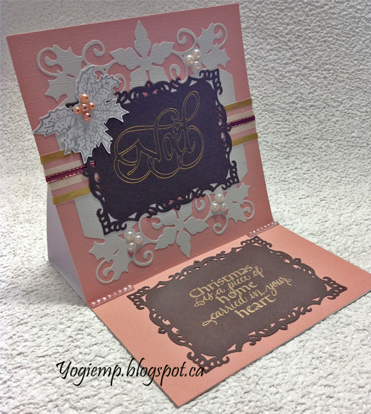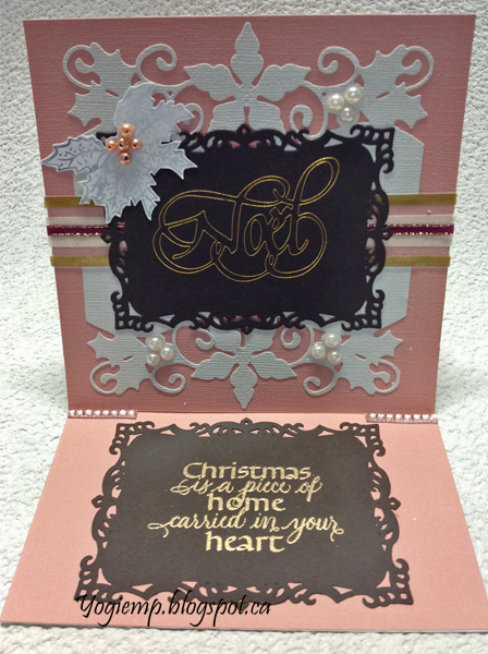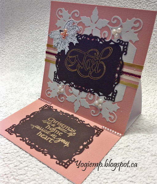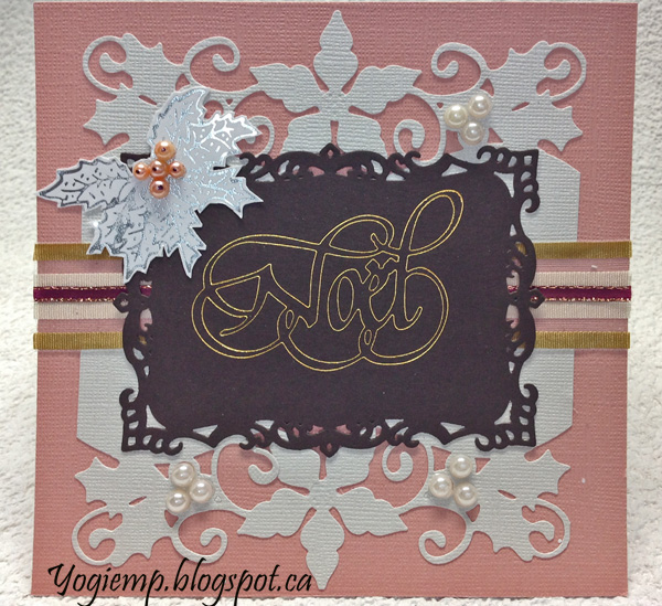 Die cut the Creative Expressions "Holly/Poinsettia Border" die set from an off white pearlized cardstock twice. Adhered to card front and adhered two types of ribbon along the center. Used the Go Press and Foil machine, my Noel die and a piece of heat sensitive gold foil on deep brown cardstock, then die cut using Spellbinders "Decorative Labels 8" die set. Adhered to front. On white cardstock, used the Press and Foil and one of their metal stamps and silver foil to create the holly cluster. Adhered to front. Added white pearls to the borders and salmon pearls to the holly, adding a black dot on each with a Sharpie. |