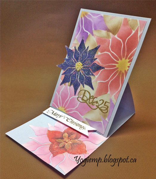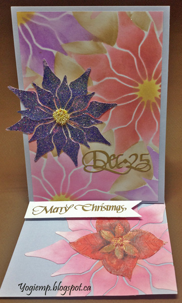 Created the background on white cardstock. First I electronically cut a large 6" poinsettia to use as a stencil (keeping the negative pieces for other parts of the card). Used a sponge and Distress Oxides, doing each flower in a different color. I also created a mask of the poinsettia, which I placed over each poinsettia and sponged some "Brushed Corduroy" in streaks away from the flower. Trimmed down and adhered to front. The glittered flower on front is a smaller version which I didn't have success in electronically cutting - the lines where too thin to hold up to the sponging... But I used the negative pieces, inking with Imperial Purple and embossing with Emerald Creek "Mardis Gras" embossing powder. Added a glob of glue in the center of the flower and applied soft yellow Prills. Die cut the "Dec 25" from a gold pearlized cardstock and adhered to front. |