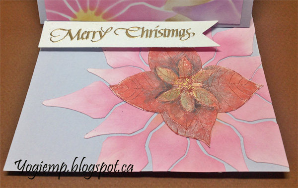 On the floor: Sponged the negative pieces of the 6"flower using "Worn Lipstick" and adhered to floor. Stamped the poinsettia with the lipstick and clear embossed. Painted with Distress pads. Fussy cut around the flourishes and adhered to the center of the negative pieced flower. Stamped the "Merry Christmas on white cardstock using Versafine Vintage Sepia and embossed with Emerald Creek "Mirror Gold" embossing powder. Trimmed down and cut a picot edge. Adhered to floor with 3D tape to act as my stopper. |