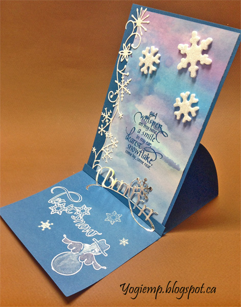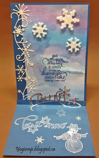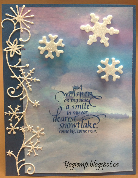 I raided my stash of Oxide backgrounds I made a while back... Trimmed down and adhered to front offset. Die cut some snowflake borders (Memory Box "Frosty Border") from white cardstock. Inked with Versamark and embossed with Emerald Creek "Soft Fallen Snow". Pieced 2 together and adhered to left edge. Adhered three adhesive backed foam snowflakes (Scrapbook Adhesives "3D Foam Holiday Embellishment Kit"). Removed the release liner from the front and sprinkled with Stickles dry glitter "Diamond". Stamped the quote using Versafine "Majestic Blue" and embossing with Emerald Creek "Blue Sparkle" embossing powder. |