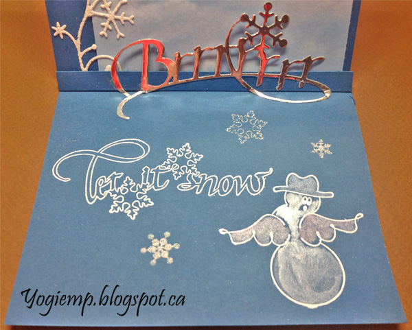 On the floor: stamped the various items using Distress Picket Fence and embossing with white embossing powder. Painted the snow angel with Kuretake Gansai Tambi Pearl Color paints Die cut the "Brrr" from DoCrafts Silver mirror cardstock. Cut, scored and adhered the die cut word and then adhered it to the floor to act as my stopper. |