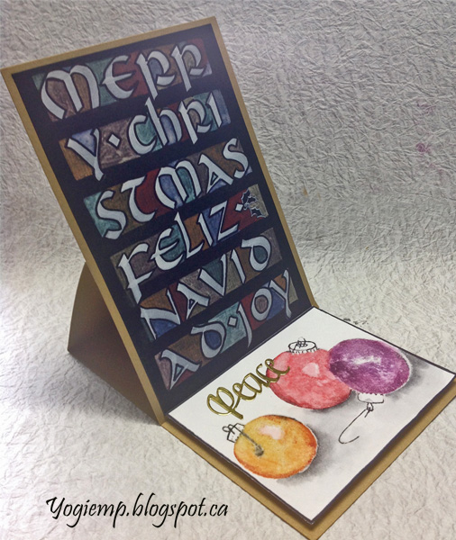 On the floor: Used my Tim's Stampin Platform to stamp the ornaments using Distress pads. Moved color around with a wet brush. Added a shadow around the ornaments. Dried and restamped using Versamark and clear embossed a couple times. Die cut the "Peace" from DoCraft gold mirror cardstock and adhered to ornament piece. Adhered to floor with 3D foam tape to act as my stopper. |