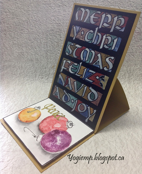 Created the calligraphic artwork on back cardstock using a white ink (Copic white Opaque mixed with H2º) and a 1/4" flat edged brush. When dry painted the negative areas using Finetec metallic watercolors. When that was dry, outlined the letters with a black Sharpie. Adhered to front.