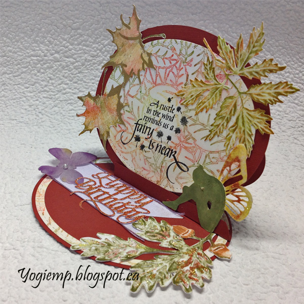 Created: October 19, 2017 A challenge called for a non rectangle or square card... so here's an oval easel and since there are a ton of fall challenges... I'm using an A Way With Words die "Happy Birthday Small" from Elizabeth Craft Designs, also available on Quietfire Design HERE And I'm using a quote stamp from Quietfire Design as well as a Silhouette cut file for the fairy. ("A Rustle In The Wind..." 4pce set );