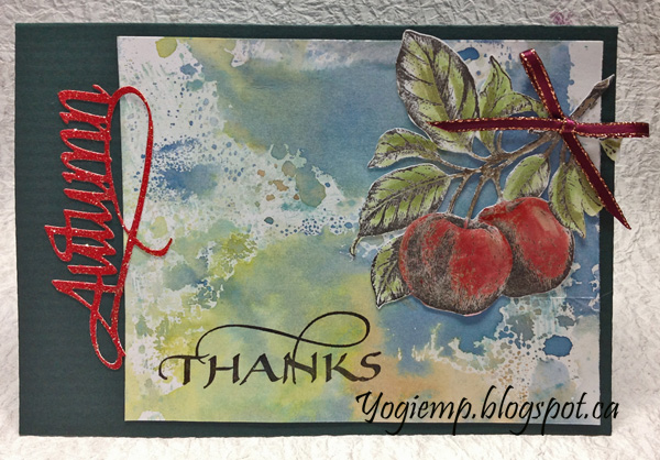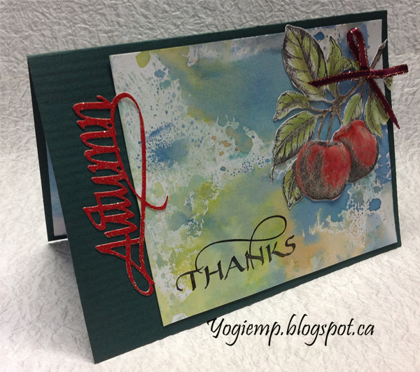 Raided my stash of Oxide backgrounds I had made a while back. Created an electronic cut file for the apples (CCDesigns), cut from white cardstock and stamped the apples using Distress pads. Used a wet paint brush to move the color around, adding more color where needed. When dry, applied Glossy Accents on the apples. Adhered the background to the front, then the apple, adding a small bow. Die cut the "Autumn" from a cream cardstock, inked with Versamark and embossed with Emerald Creek "Chinese New Year". Stamped the "Thanks" using Versafine Black Onyx and clear embossed. |
