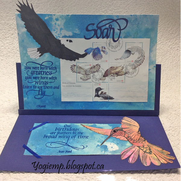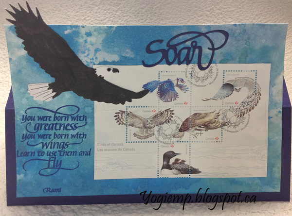Created: September 7, 2017 I picked up a souvenir stamp sheet of the Canadian bird images... Well I thought it was a souvenir sheet, but was actually a first edition cancelled post card... unusable as postage Sigh!!! So I removed it from the card base and adhered it to my card. I'm using one of the newest an A Way With Words dies "Soar" from Elizabeth Craft Designs, also available on Quietfire Design HERE As well as quote stamps from the "Soar Collection" 8pce and "Happy Birthday Collection" 8pce clear stamp sets from Elizabeth Craft Designs also available on Quietfire Design HERE and HERE