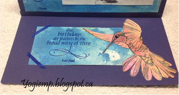 On the floor: Stamped the quoteon a scrap of the Oxide background using the blue and clear embossing. Adhered to floor adding a couple piece of blue narrow ribbon on the corners. Electronically cut the bird image and stamped (Designs By Ryn) using Versafine Black Onyx and clear embossed. Painted with Distress pads. Adhered to floor. Added a small black rhinestone for the eye. Scored and folded and adhered a lip to act as my stopper from the blue cardstock. |