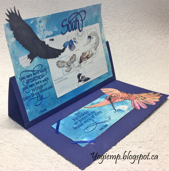 Cut a piece from a Distress Oxide background a bit smaller than my card base. adhered the postage image. Found an eagle image and electronically cut it from white cardstock. Inked the body with a black marker. Adhered to background piece. Die cut the "Soar" from dark blue cardstock an adhered to background. Stamped the quote using Versafine "Majestic Blue" stamp pad and clear embossing Adhered background to card front. |