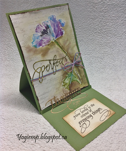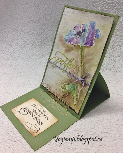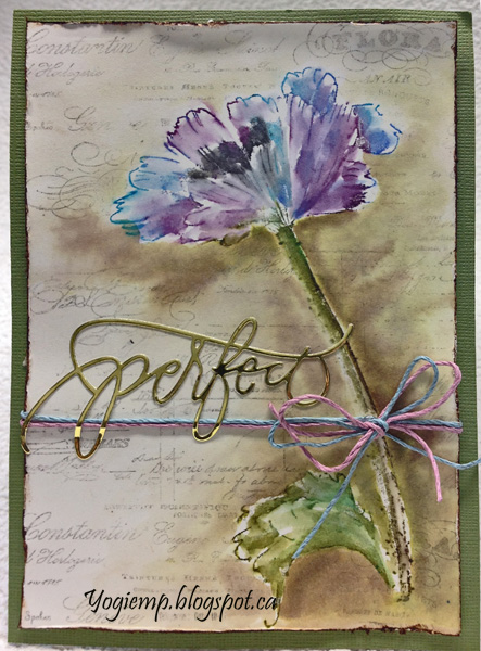 Stamped the flower on watercolor paper using my Stamp Platform (Tim's) and Distress pads. Created a mask of the flower and then stamped the text background (Heidi Swapp) using an older Versafine Black Onyx stamp pad - gave a more greyish tone. Distress the edges with Tim's distresser. Hit the edges with a dark brown sponge. Tied some blue and pink twine around the layer and then adhered to front. Adhered a bow with the same twine. Die cut the "Perfect" from the gold mirror cardstock (DoCrafts) and adhered to front.