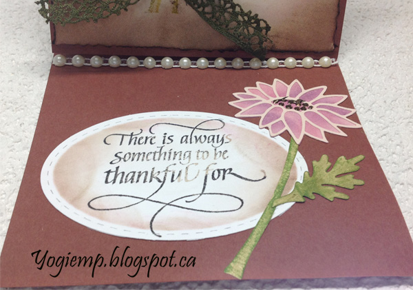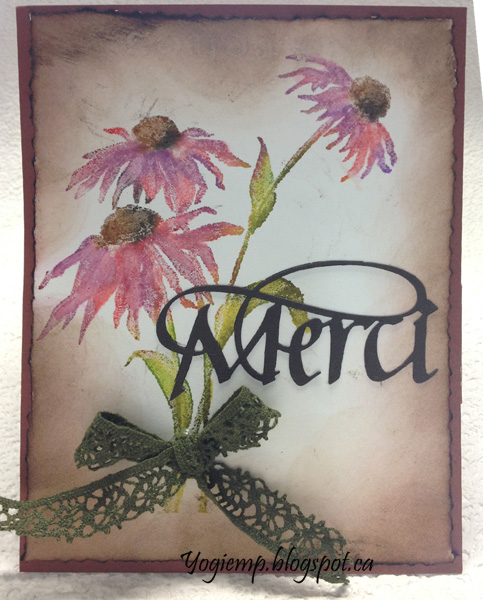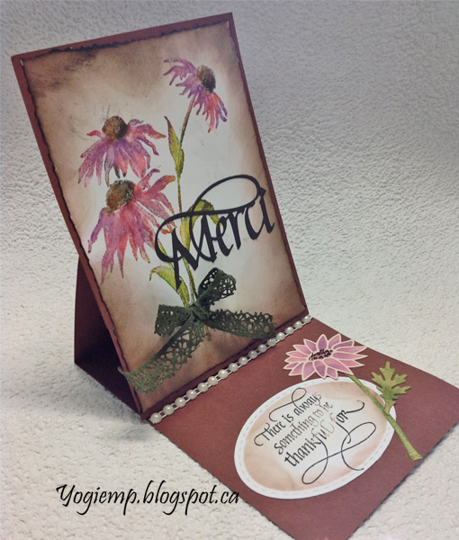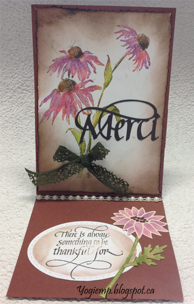 Used a deckle edged scissor around the edges, then sponged Distress browns around the edges. Adhered to front. Die cut the "Merci from black cardstock and adhered. Tied a olive green bow and adhered toflower stem.