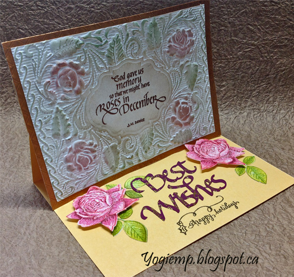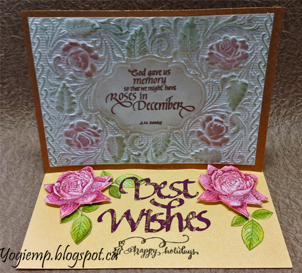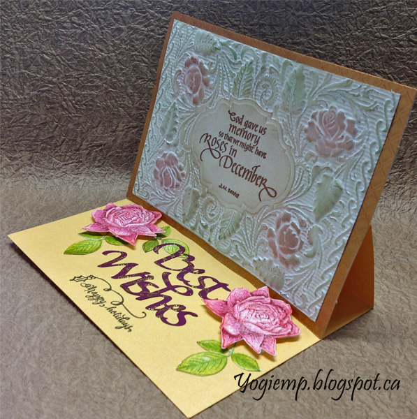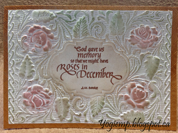 Created: September 11, 2017 I just acquired several Crafters Companion 3D embossing folders (English Rose being used today, Ornate Lace and Regency Swirls). They are gorgeous. I'm using an A Way With Words dies "Best Wishes" from Elizabeth Craft Designs, also available on Quietfire Design HERE And I'm using a quote stamp and design element stamp from Quietfire Design. ("God Gave Us Memory");