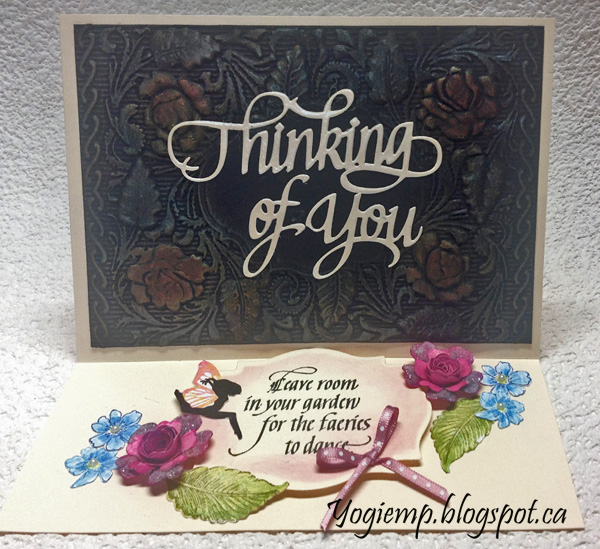 Created: September 9, 2017 I just acquired several Crafters Companion 3D embossing folders (English Rose being used today, Ornate Lace and Regency Swirls). They are gorgeous. I'm using an A Way With Words dies "Thinking Of You" from Elizabeth Craft Designs, also available on Quietfire Design HERE And I'm using a quote stamp and design element stamp from Quietfire Design. ("Leave Room In Your Garden"); ("A Rustle In The Wind" 4pce set)