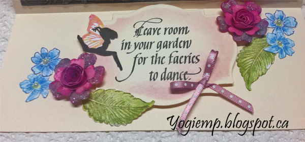 Stamped the fairy on white cardstock using Distress pads and then colored the body of the fairy with a black marker. Fussy cut around her and adhered to floor. Raided my stash for the Die-Namics Heirloom Hybrid Roses. I applied clear nail polish to the bottom layer of petals and then immediately dipped them in Ranger's Rock Candy glitter. The leaves and blue flowers were electronically cut and then stamped and or colored with Prisma colored pencils (AlteNew "Garden Treasures"). Added a mini white pearl in each blue flower. Final touch added a pinky toned dotted bow