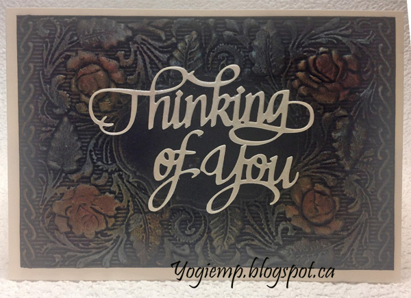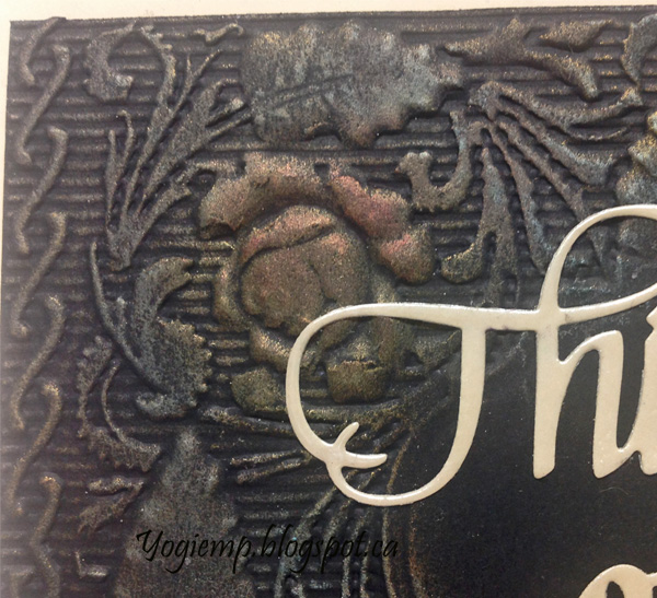 Cut another piece same size as card and adhered to front. I ran my black cardstock through my embossing machine. NOTE: highly recommend lightly misting the back of your cardstock prior embossing or else you will get lots of cracking in your cardstock... I used my finger to rub on Metallic Rub On paste in various colors. Trimmed down and adhered to card front. Die cut the "Thinking of You" from a cream toned cardstock, inked with Versamark and embossed with Pearlescent embossing powder. |